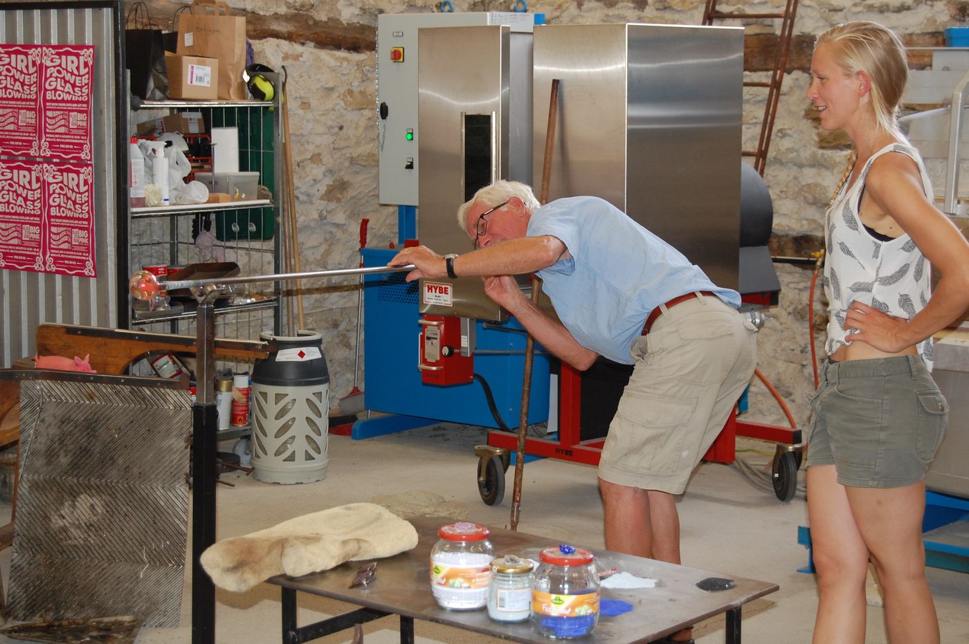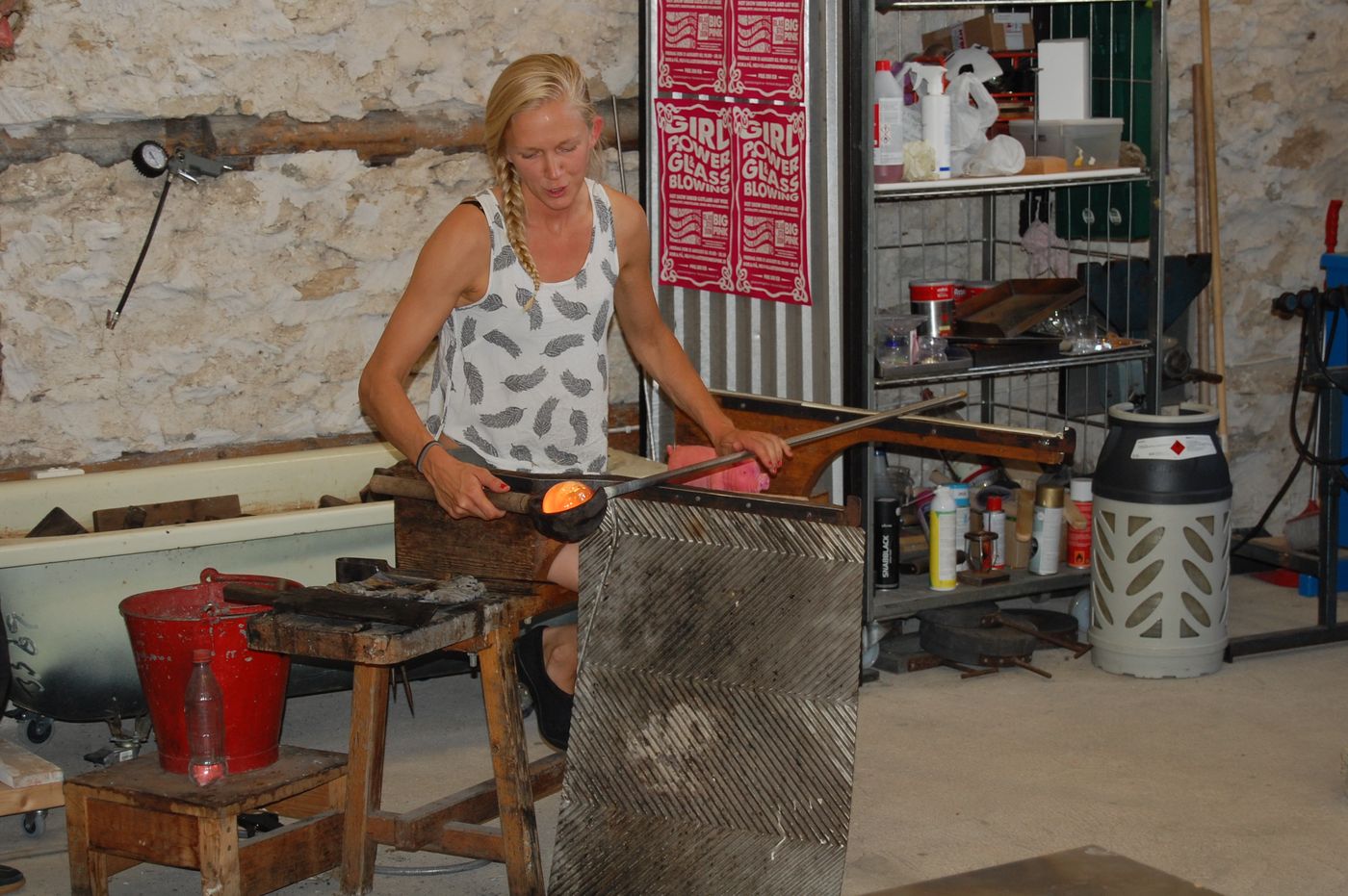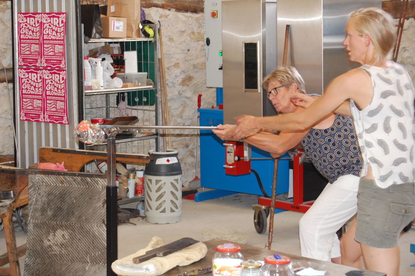 Nästa besöksmålet var den nya glashyttan Big Pink, som Stångatösen Jennie Olofsson nyligen hade byggt upp i ladugården på den fd gård som hon och hennes man hade köpt i Norrlanda. Här hade hon en fullutrustad verkstad. Jennie hade ordnat sittplatser åt alla framför ugnarna, som spred en rejäl värme, det var 1.150 grader i den stora ugnen. Jennie berättade på ett väldigt medryckande sätt om glas och glasblåsning och visade under tiden hur man blåser olika föremål som kannor och vinglas. Som assistent hade hon sin svärmor Gitte, för i vissa moment måste man vara två stycken. Vi fick se hur föremålen så snabbt och till synes enkelt växte fram, Jennie är onekligen mycket skicklig och fick många applåder! Som avslutning fick tre personer ur publiken prova att blåsa, då såg man hur svårt det egentligen är! Efter förevisningen ville många handla vackra glasföremål!