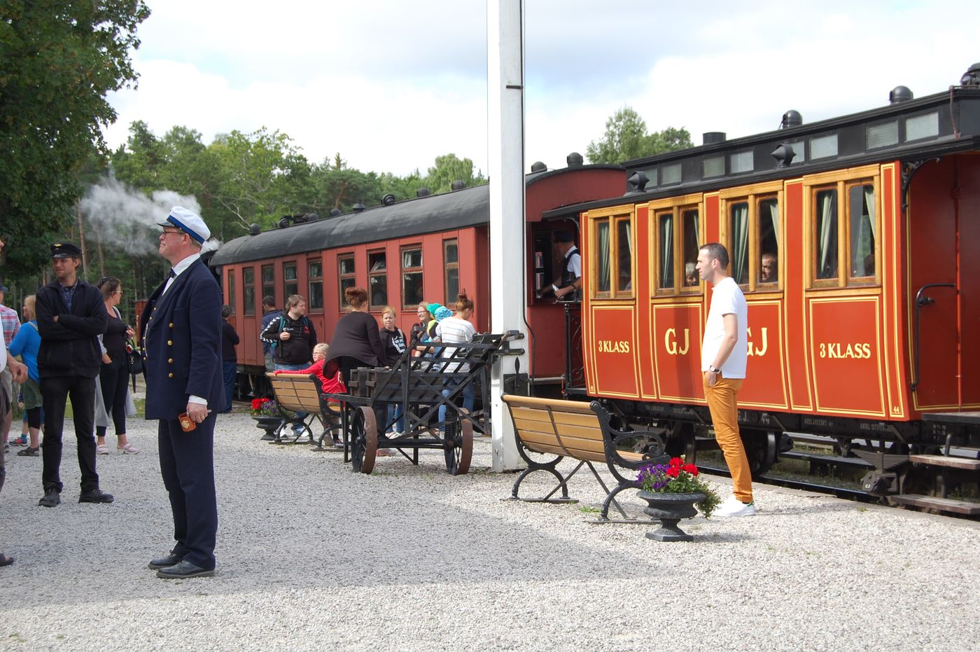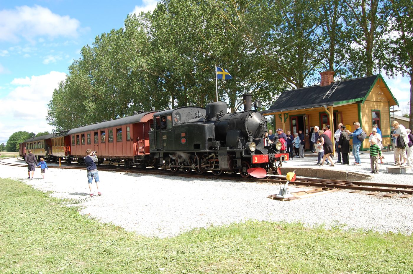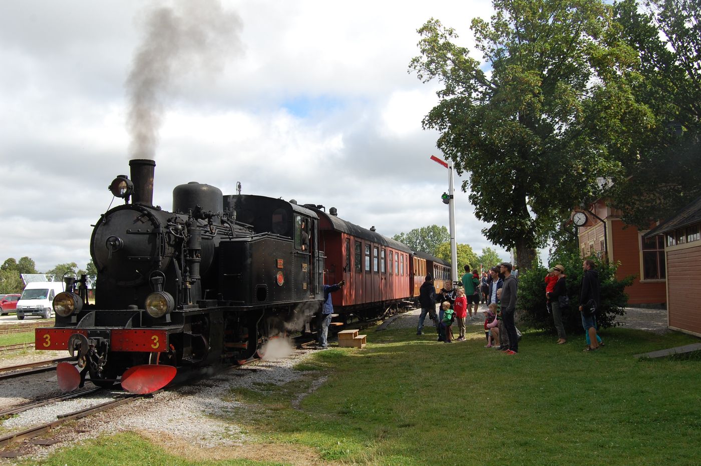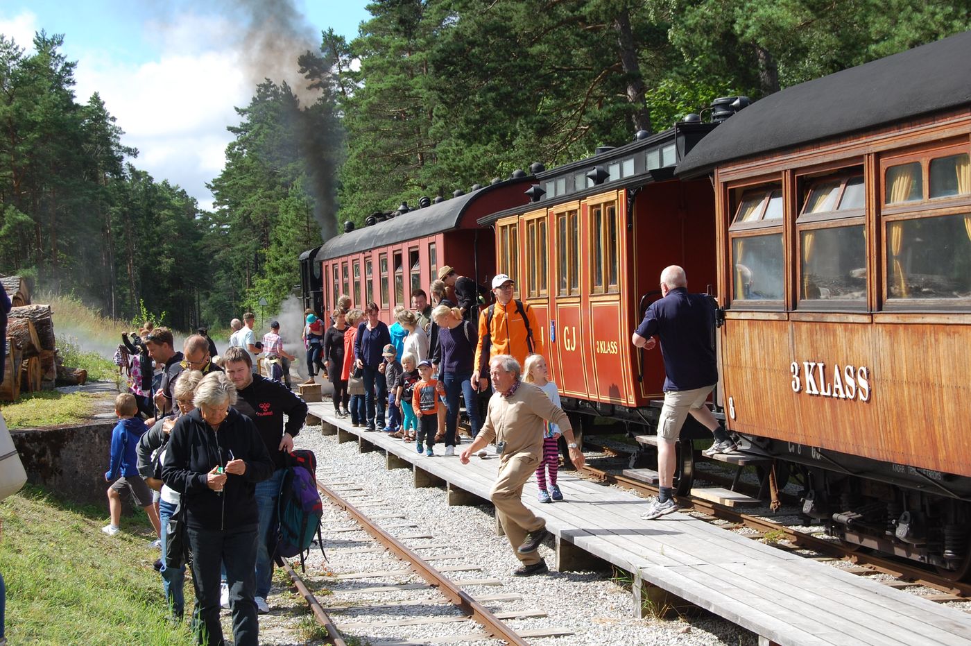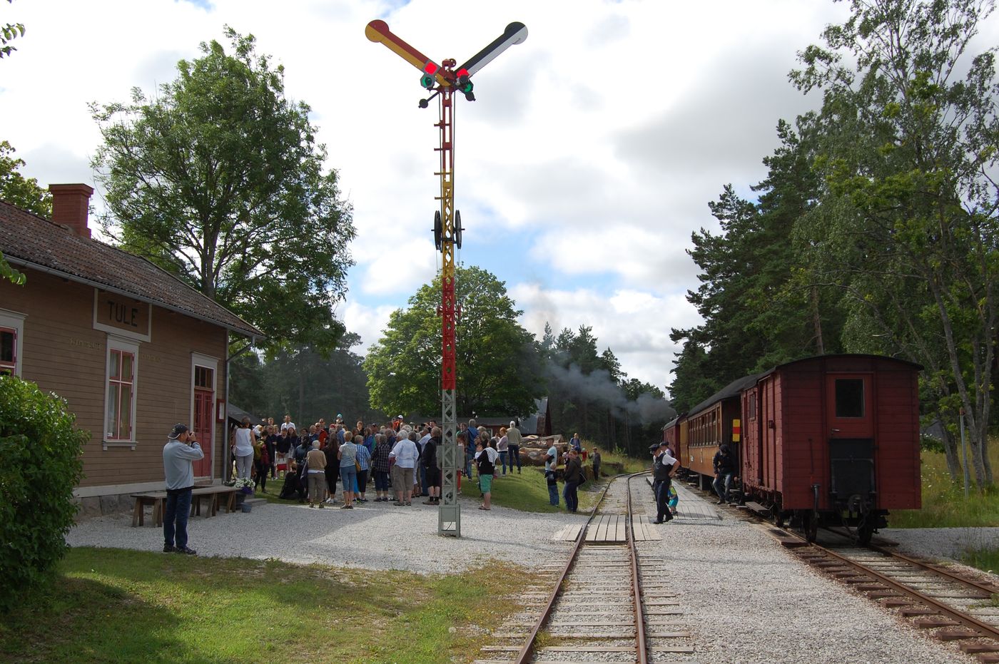 Sedan ställdes kosan till Gotlandståget. När vi kom så var vagnarna framkörda och ångloket tuffade fram och tillbaka. Det var massor av folk på stationsområdet och en jättekö till biljettluckan. Förväntan var stor och till sist kom alla ombord på ett fullsatt tåg. Så tuffade vi iväg genom landskapet, passerade Romavägen och Dalhemsån och kom efter ett tag fram till Tule station, där alla klev av. Tågbefälhavaren berättade på ett utmärkt sätt och Gotlands järnvägshistoria, innan det var dags för ombordstigning igen.