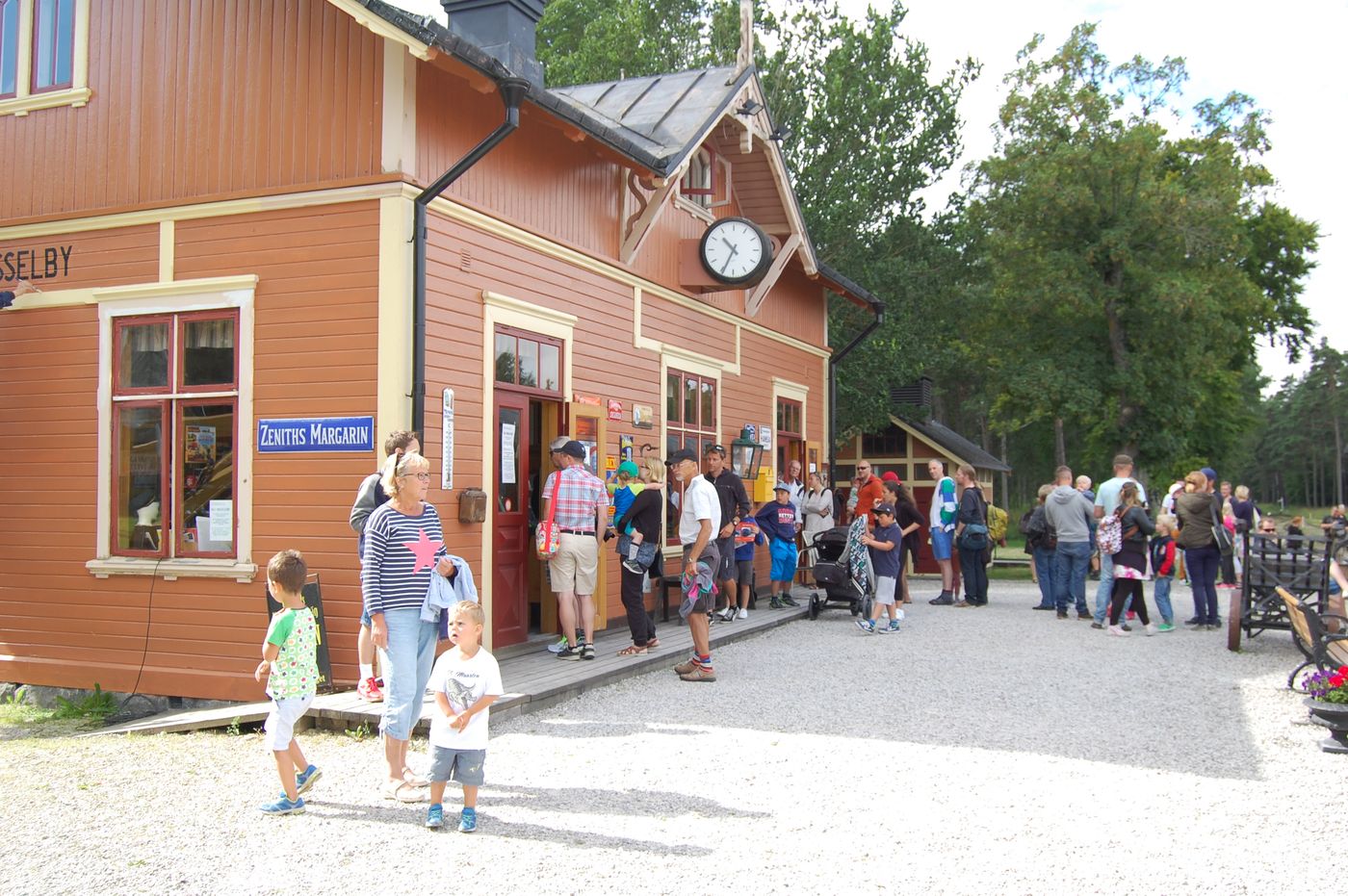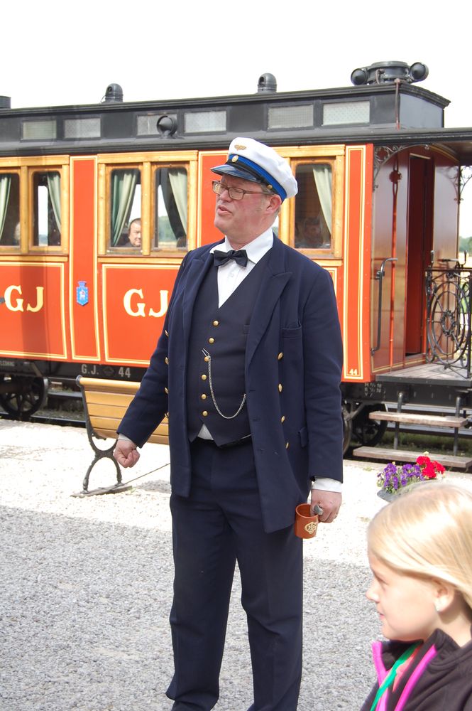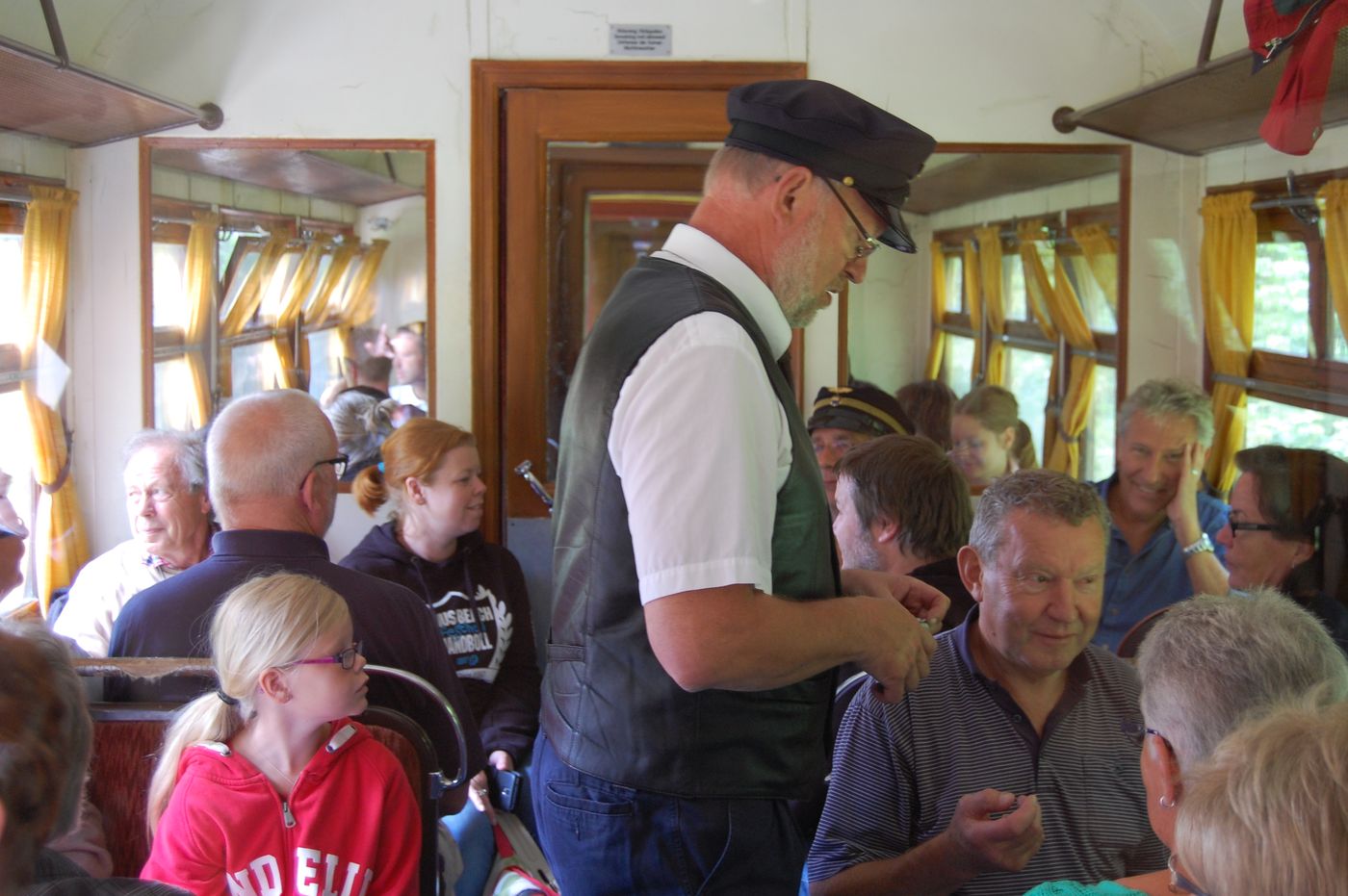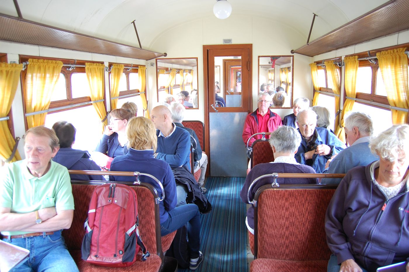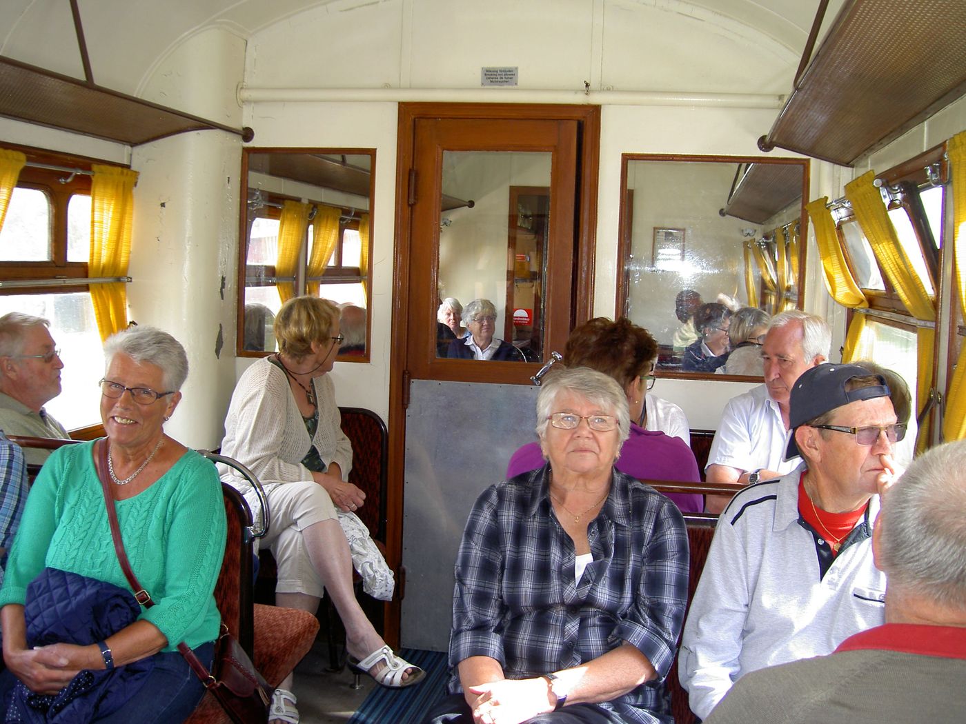 Sedan ställdes kosan till Gotlandståget. När vi kom så var vagnarna framkörda och ångloket tuffade fram och tillbaka. Det var massor av folk på stationsområdet och en jättekö till biljettluckan. Förväntan var stor och till sist kom alla ombord på ett fullsatt tåg. Så tuffade vi iväg genom landskapet, passerade Romavägen och Dalhemsån och kom efter ett tag fram till Tule station, där alla klev av. Tågbefälhavaren berättade på ett utmärkt sätt och Gotlands järnvägshistoria, innan det var dags för ombordstigning igen.
