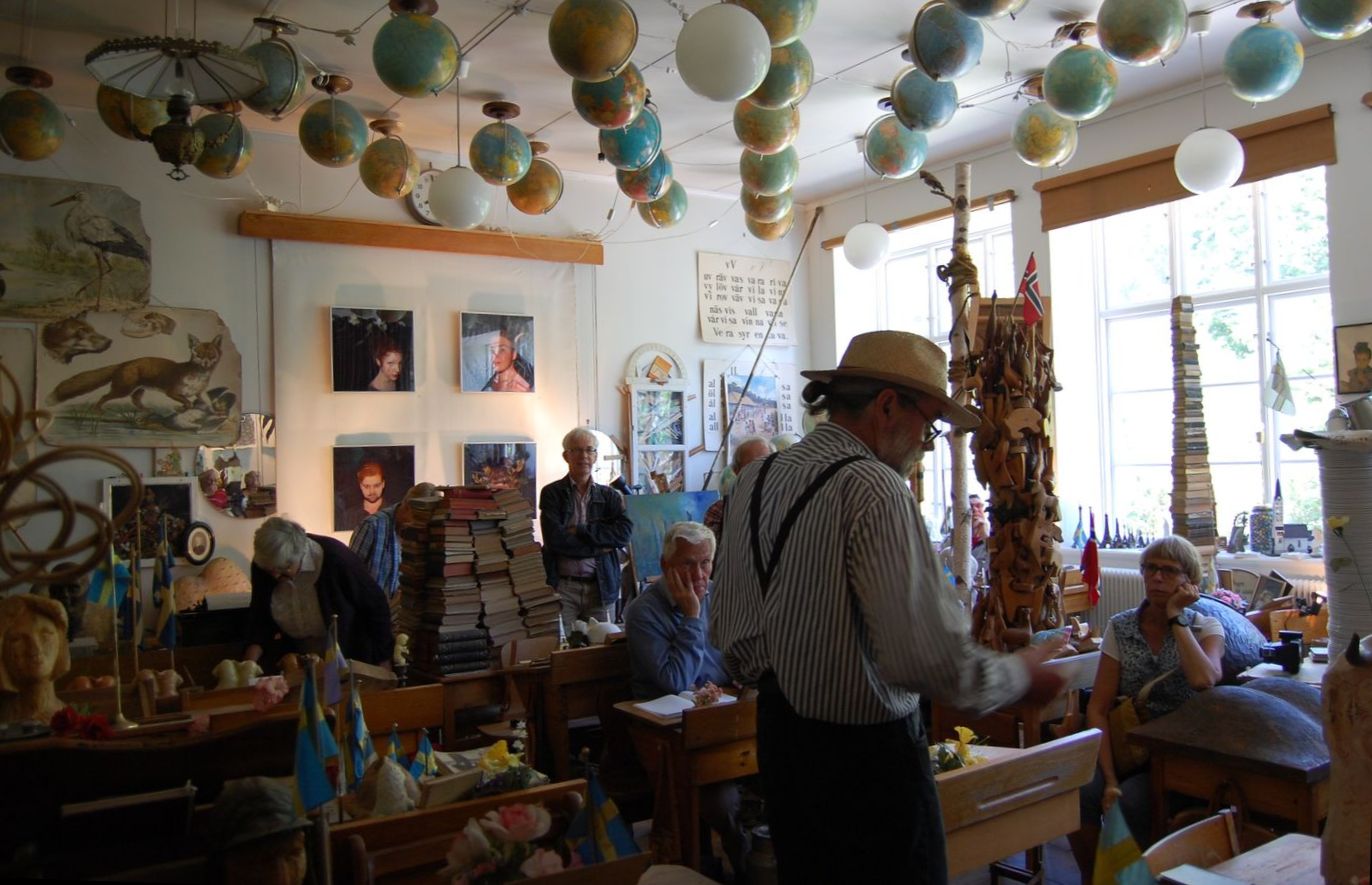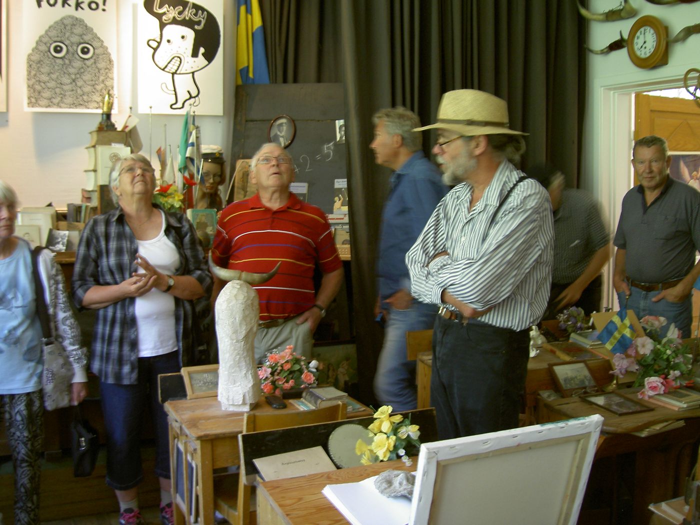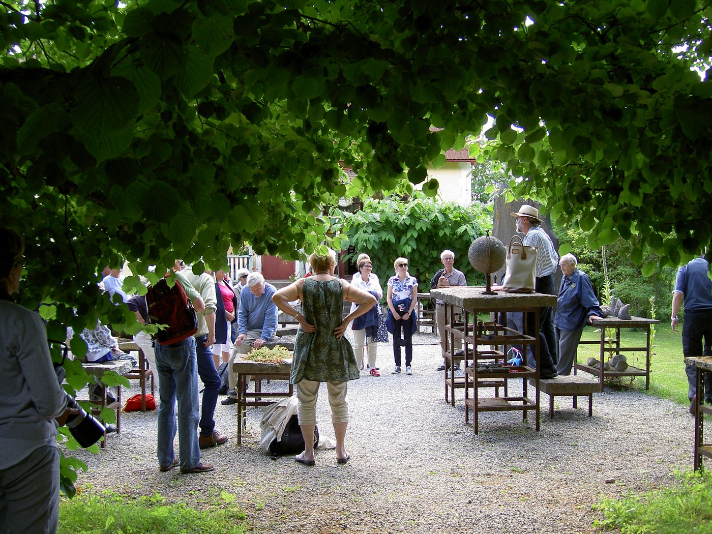Nu var alla hungriga och Rolf körde oss till Hotell Dalhem, där en ljuvlig lunch väntade oss. Efter måltiden bar kosan iväg till Skolmuseet i Vänge. Konstnär Anders Thorlin tog emot och berättade om bakgrunden till detta originella museum med konstpark. Här finns enorma mängder med skulpturer och annat, vilka ger anledning till eftertanke och reflexion över tillvaron. Det medhavda kaffet dracks i den stämningsfulla trädgården.