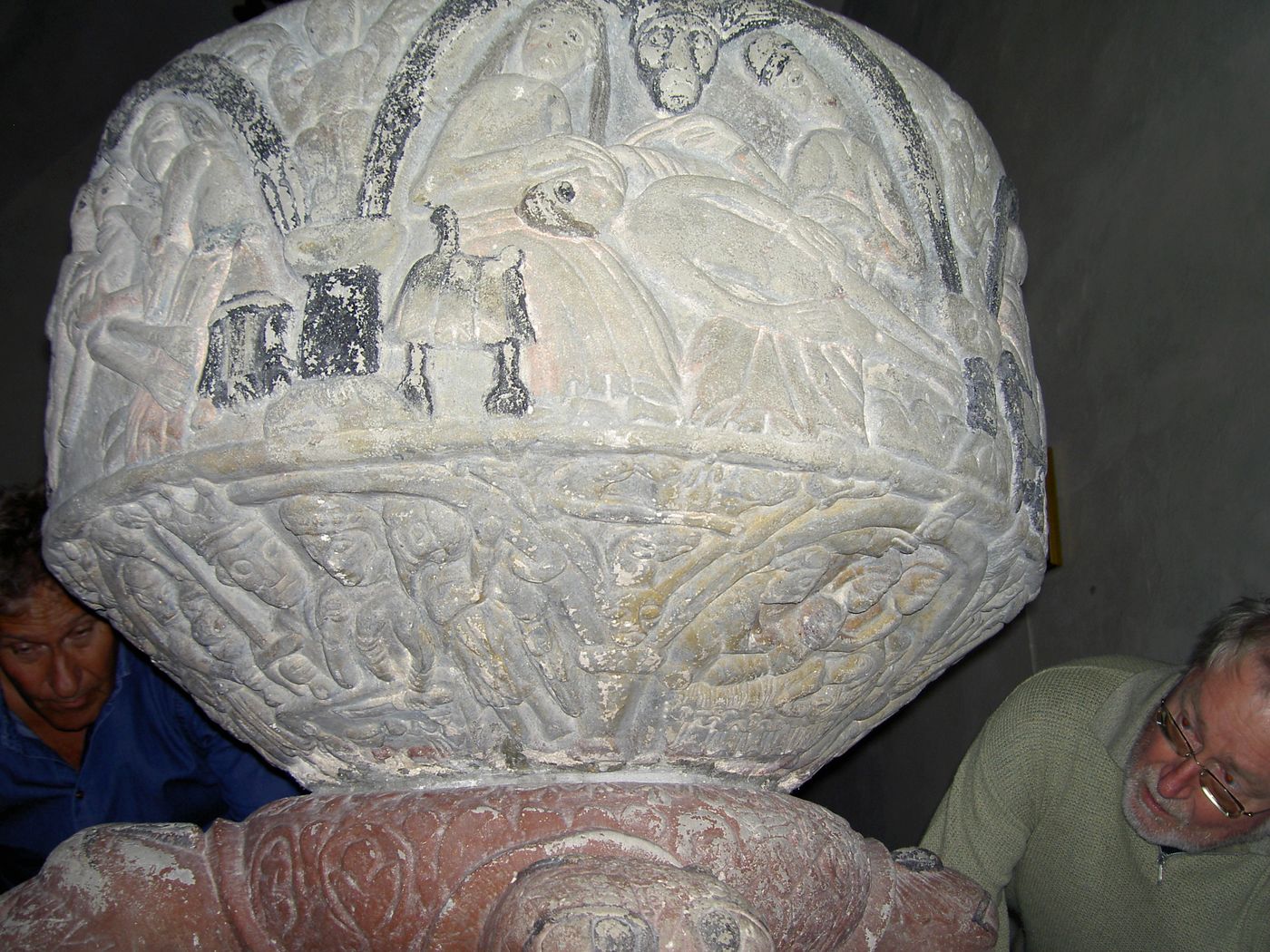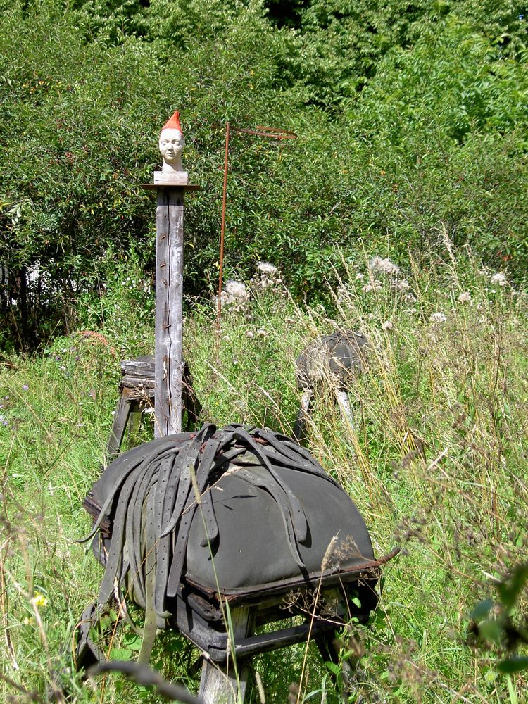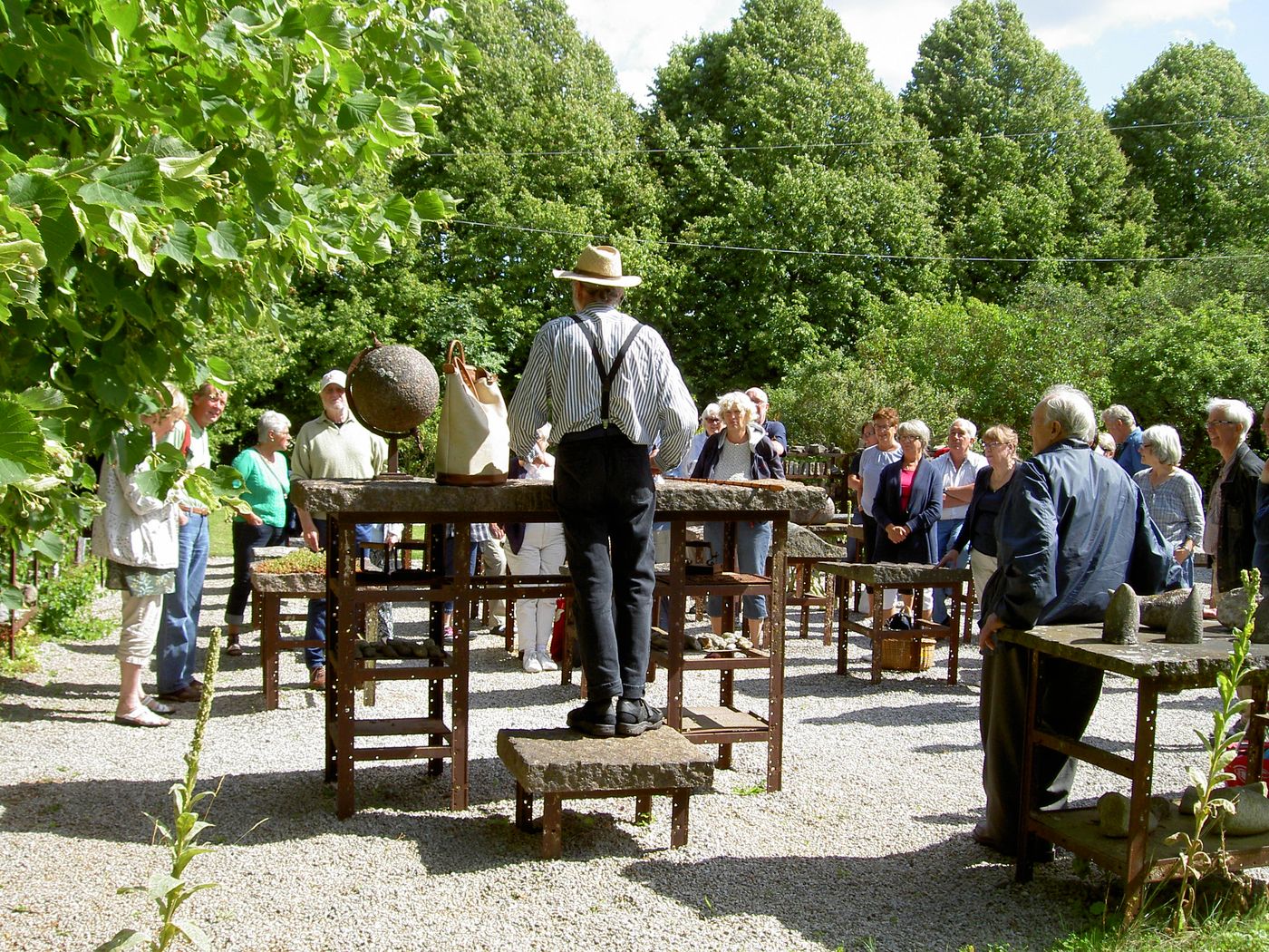 Nu var alla hungriga och Rolf körde oss till Hotell Dalhem, där en ljuvlig lunch väntade oss. Efter måltiden bar kosan iväg till Skolmuseet i Vänge. Konstnär Anders Thorlin tog emot och berättade om bakgrunden till detta originella museum med konstpark. Här finns enorma mängder med skulpturer och annat, vilka ger anledning till eftertanke och reflexion över tillvaron. Det medhavda kaffet dracks i den stämningsfulla trädgården.