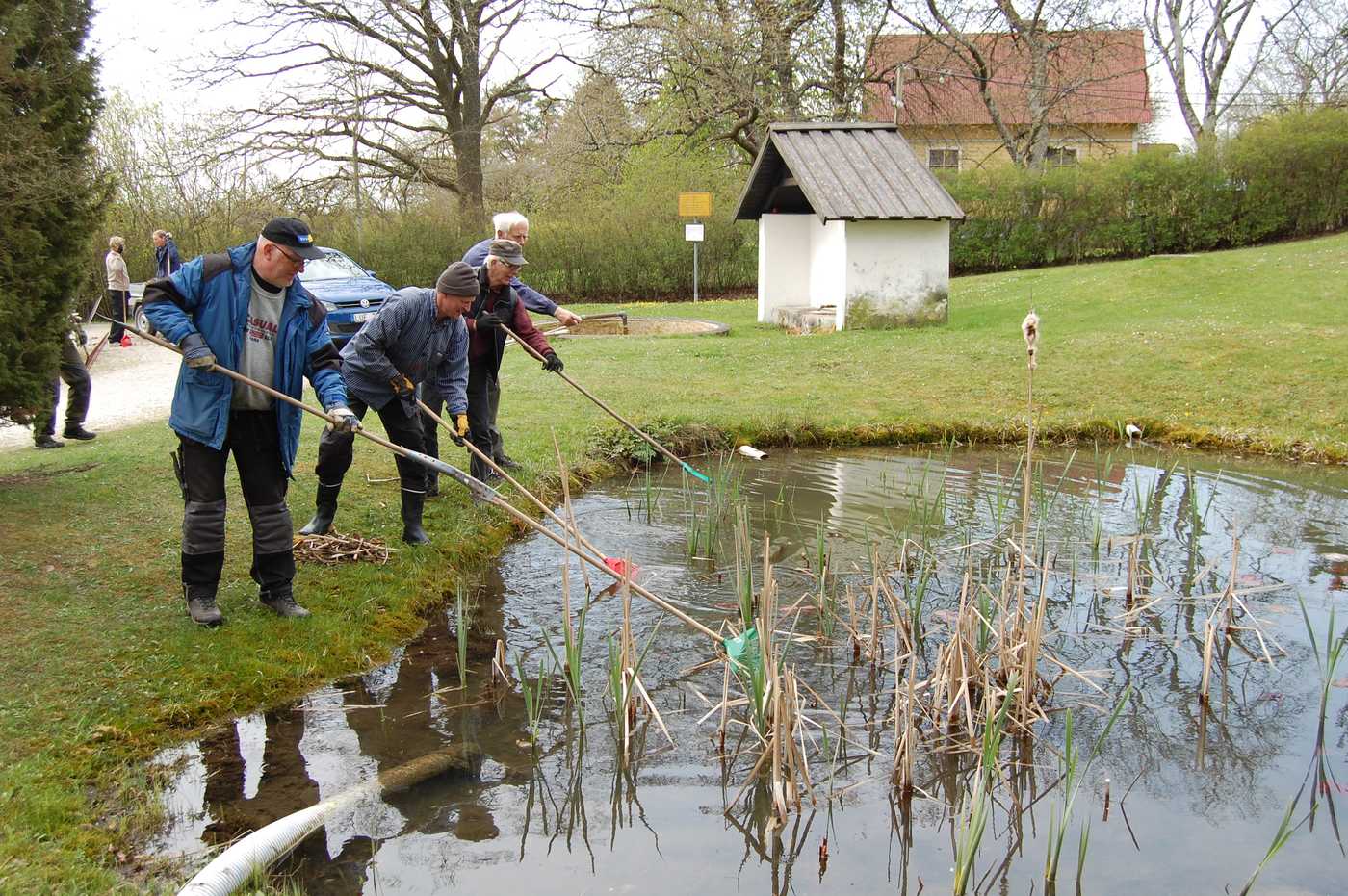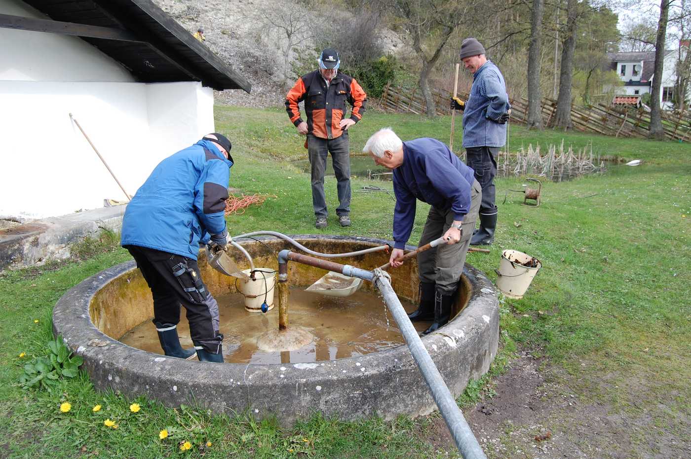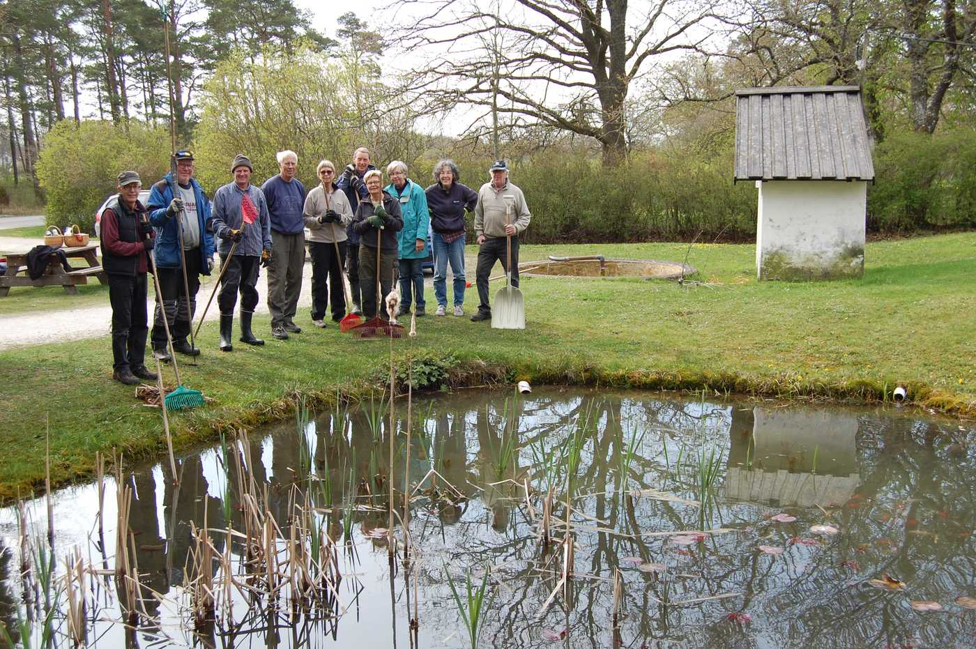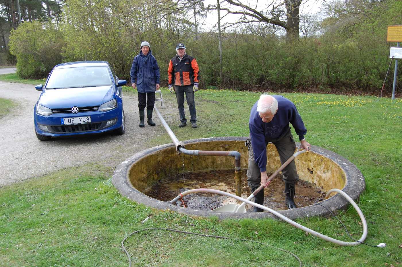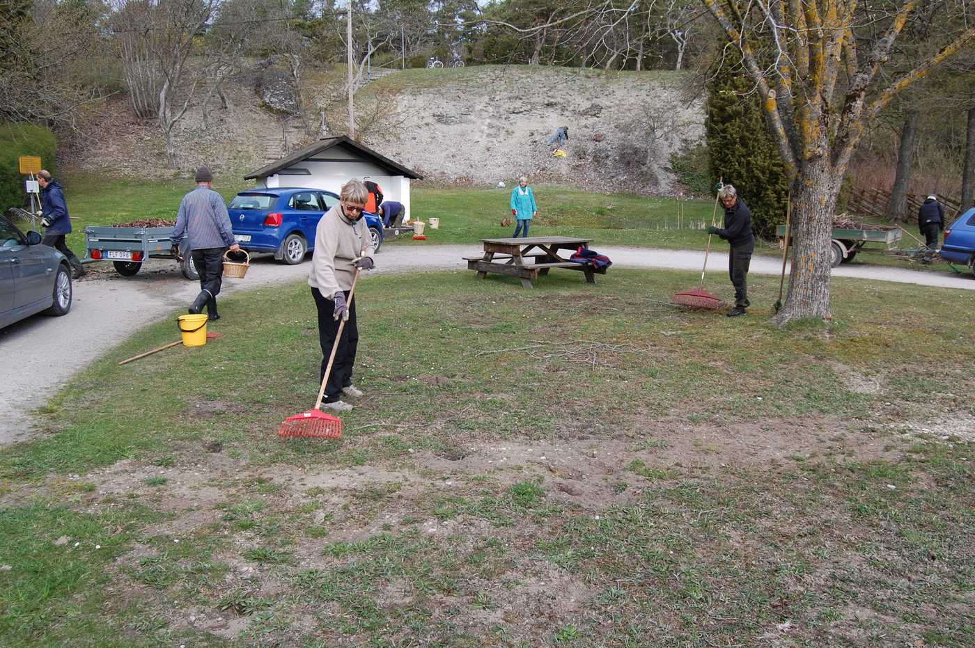 Traditionsenligt vårstädades området vid Lau Käldu på förmiddagen 1 maj. Arbetsamma föreningsmedlemmar samlades kl 9 med räfsor och verktyg. Robert var på plats långt tidigare för att få i ordning pumpanläggningen, så att bassängen kunde tömmas och rengöras. All utrustning fungerade som den skulle och bassängen var redan nästan tömd när övriga anlände. Solen sken och fåglarna kvittrade, det var en ljuvlig vårdag. Snabbt räfsades alla löv och kvistar ihop och bars till släpkärrorna. Andreas hade med sig sin nya fina släpkärra som det nästan var synd att lägga löv och skräp i. Men den var behövlig, för trots att det inte såg ut att vara så mycket, så blev kärrorna fullpackade. Med stort tålamod klippte och sågade Christina bort allt sly i sluttningen, vi vill att backanten skall vara synlig och inte igenvuxen. Robert, Börje och Göran skrubbade bassängen ren från alger, det blev nästan som en badbassäng! Ur näckrosdammen fiskades det upp alla döda vassblad mm, så att vattenytan blev ren och man kan se guldfiskarna.