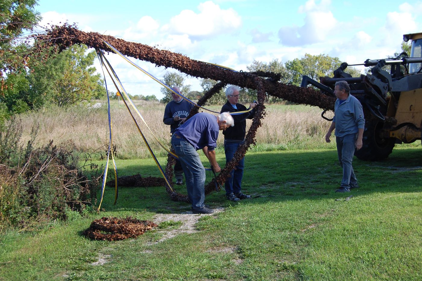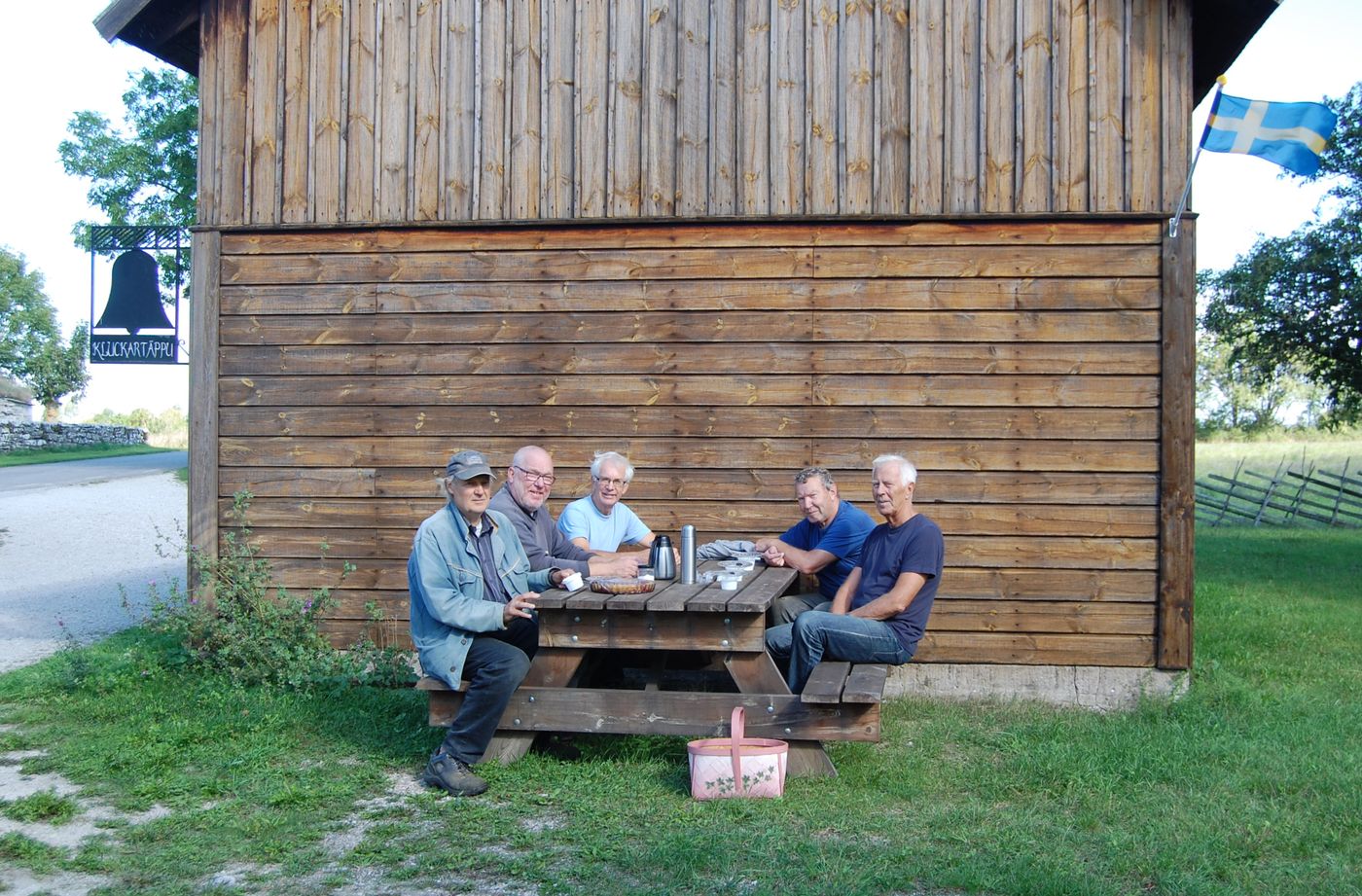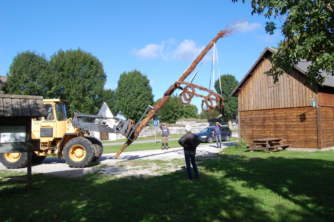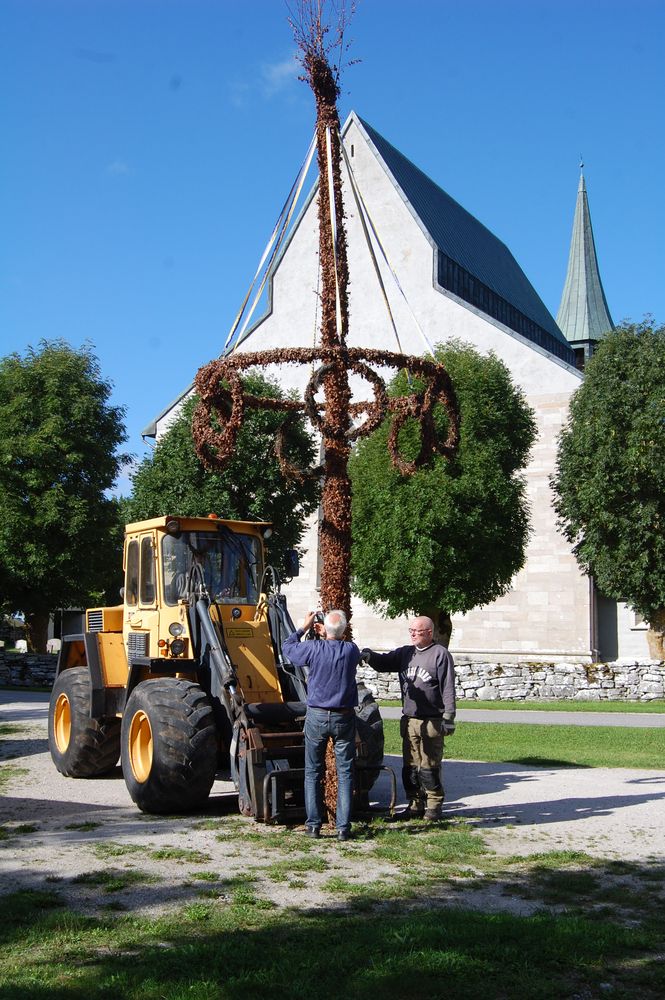 Den 2 september var det dags att ta ner midsommarstången. Som vanligt hade den prytt sin plats vid Kluckartäppu hela sommaren, men nu började den bli lite sliten av väder och vind. I år hade vi en greppvänlig bult i stången, så enkelt kunde Eddie sätta fast en kätting och lyfta upp hela stången med lastaren. Galant gick det! Sen körde vi bort stången med kransarna till skräphögen bakom kastalruinen och klädde av alltihop. Lätt gick det i det fina vädret. Så bars alltihop in i sockenmagasinet i väntan på nästa midsommar. Gott smakade sedan kaffet och kakan som Gittan hade bakat!