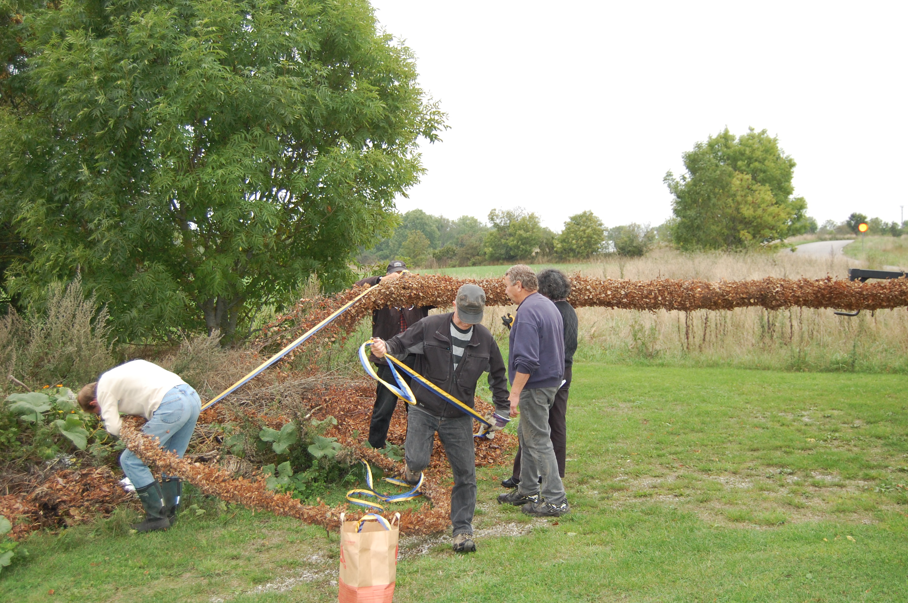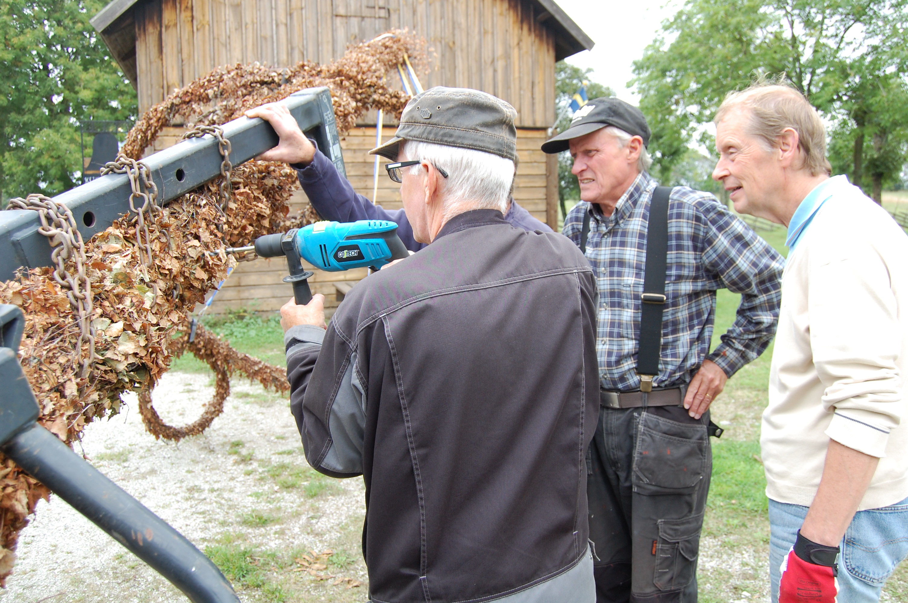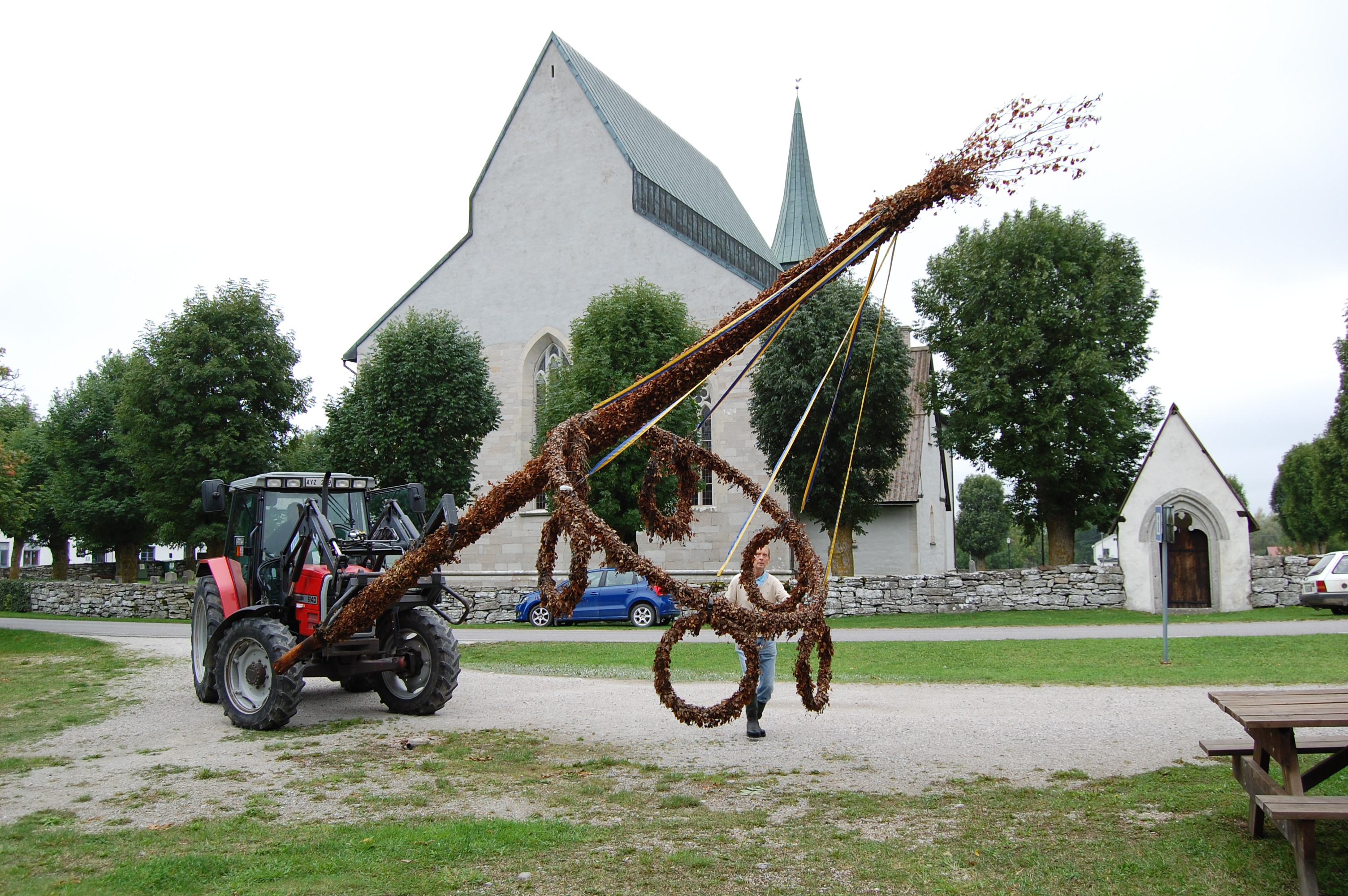Den 16 september var det dags att ta ner midsommarstången, trots att vädret ännu var ganska sommarlikt. Eddie hade som vanligt traktor med lastare, i vilken vi kedjade fast stången. Efter vissa vedermödor gick det att få upp den ur cementröret och köra iväg den för avklädning. Många kom och hjälpte till, det var en trevlig stund, fast lite vemodigt nu när sommaren så tydligt var slut. Stången och alla ringarna lades som vanligt in i sockenmagasinet i väntan på nästa sommar. Efteråt drack vi kaffe och pratade om sommarens begivenheter.