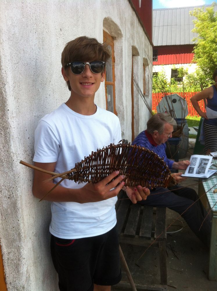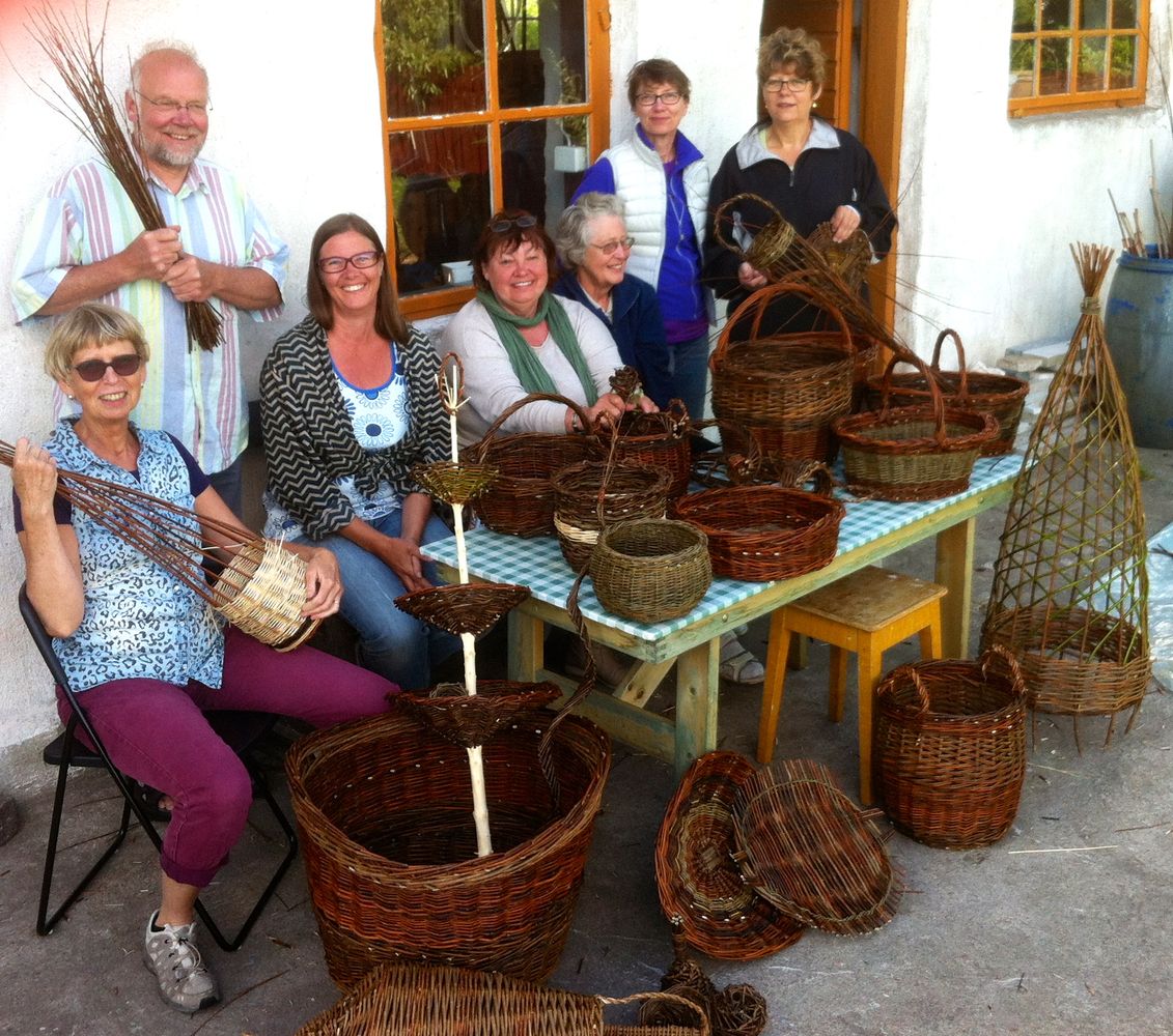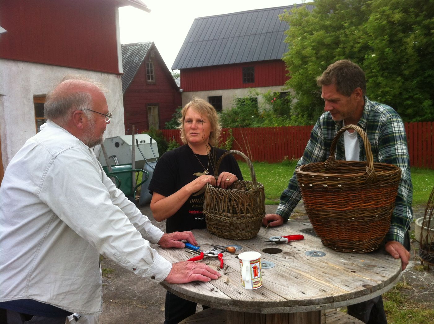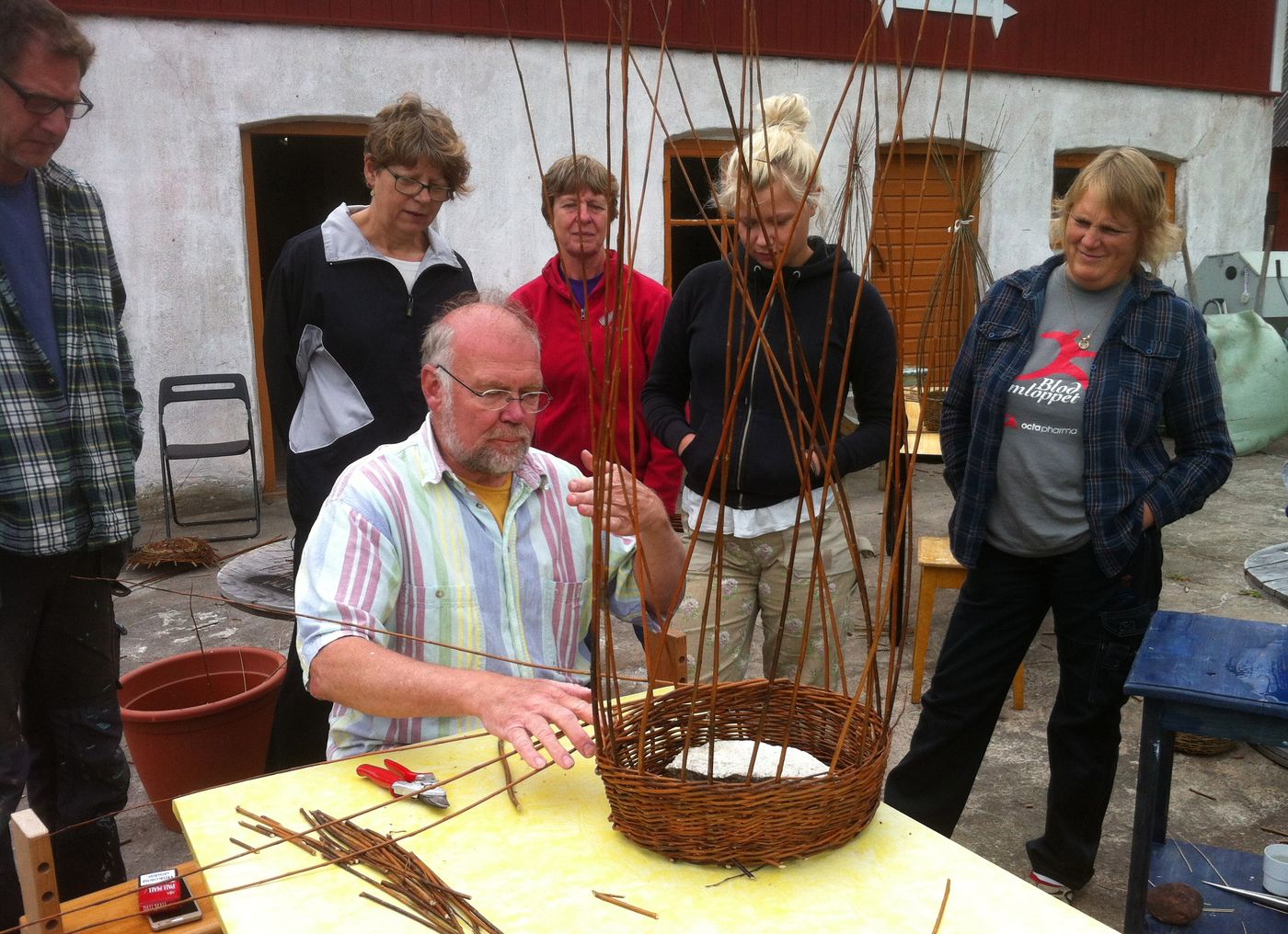Steen Madsen, korgmakare från Danmark, besökte oss på Kyrkänge i Lau för fjärde sommaren i rad för att lära oss att fläta med korgpil. Han är en mycket god pedagog med massor av kunskap och tålamod med nybörjare och för de mera vana. Pil kan användas till mycket och vi har flätat korgar av olika utseende, fat, blomsterstöd, leksaker m.m.