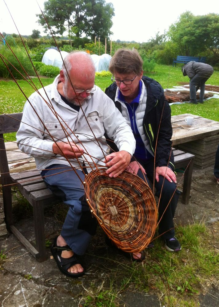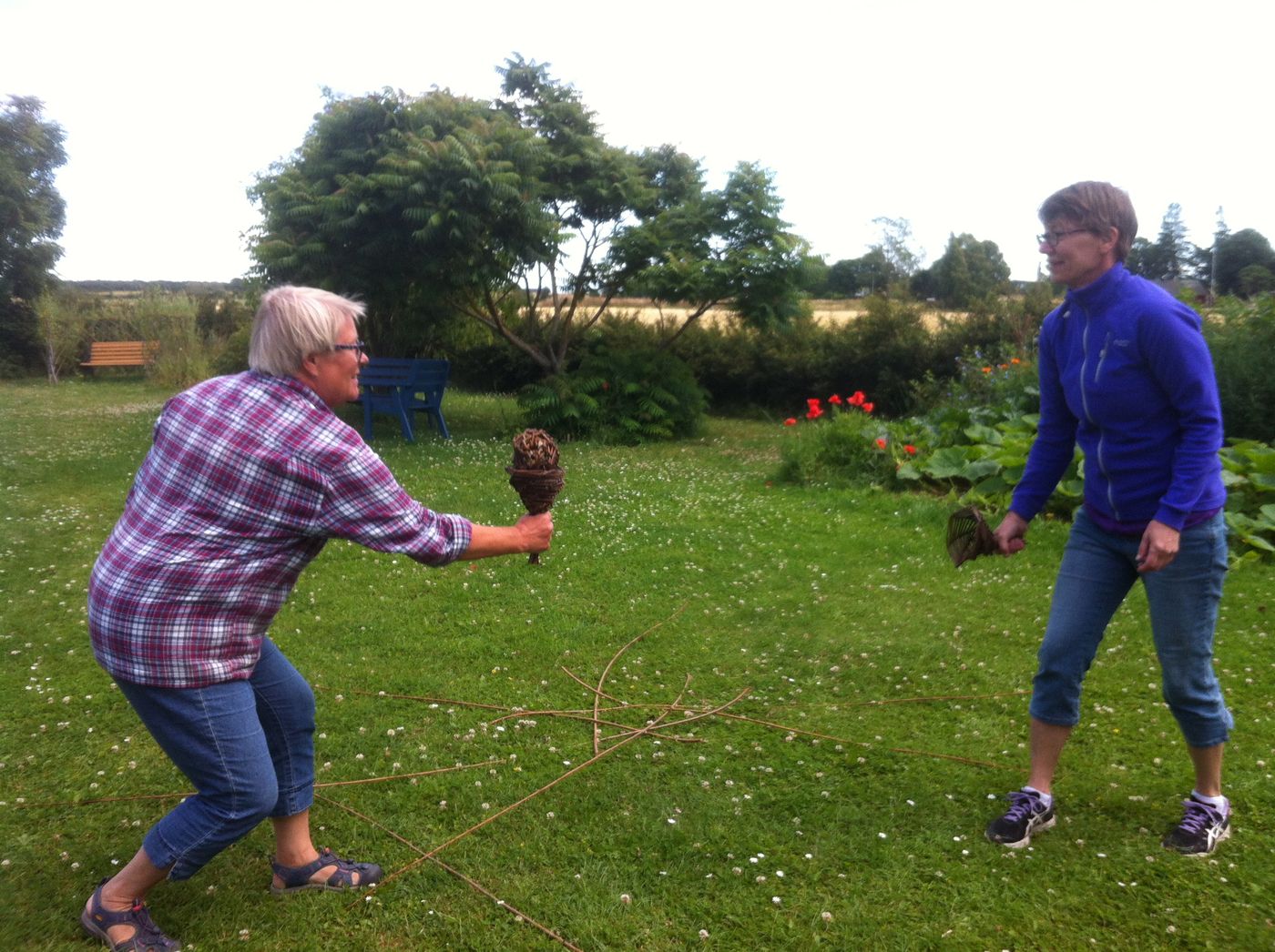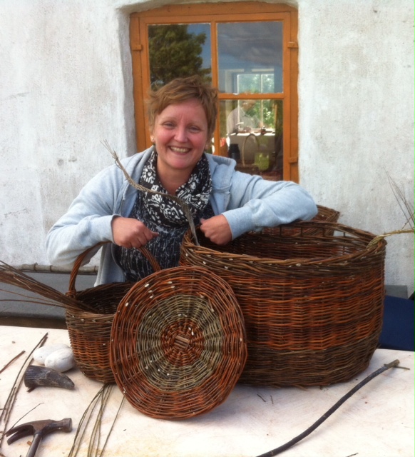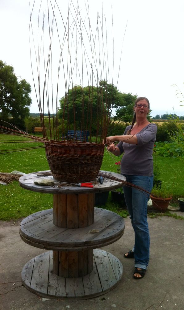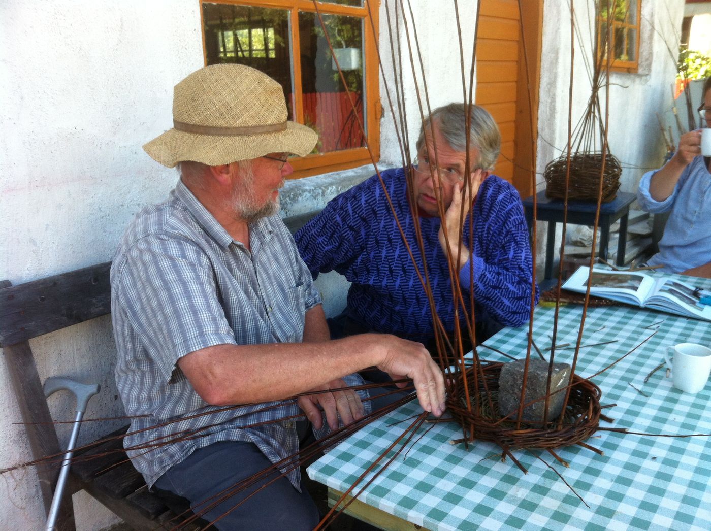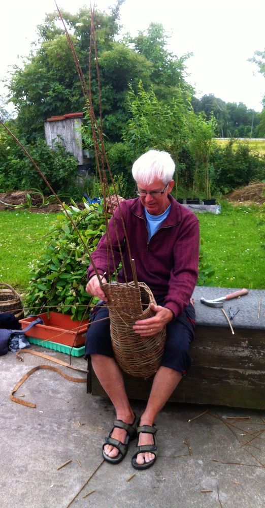 Steen Madsen, korgmakare från Danmark, besökte oss på Kyrkänge i Lau för fjärde sommaren i rad för att lära oss att fläta med korgpil. Han är en mycket god pedagog med massor av kunskap och tålamod med nybörjare och för de mera vana. Pil kan användas till mycket och vi har flätat korgar av olika utseende, fat, blomsterstöd, leksaker m.m.
