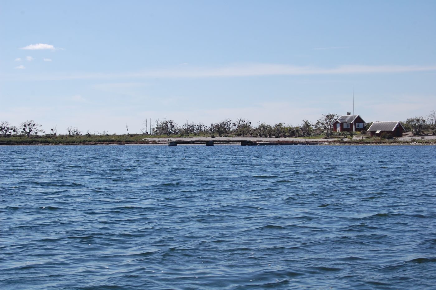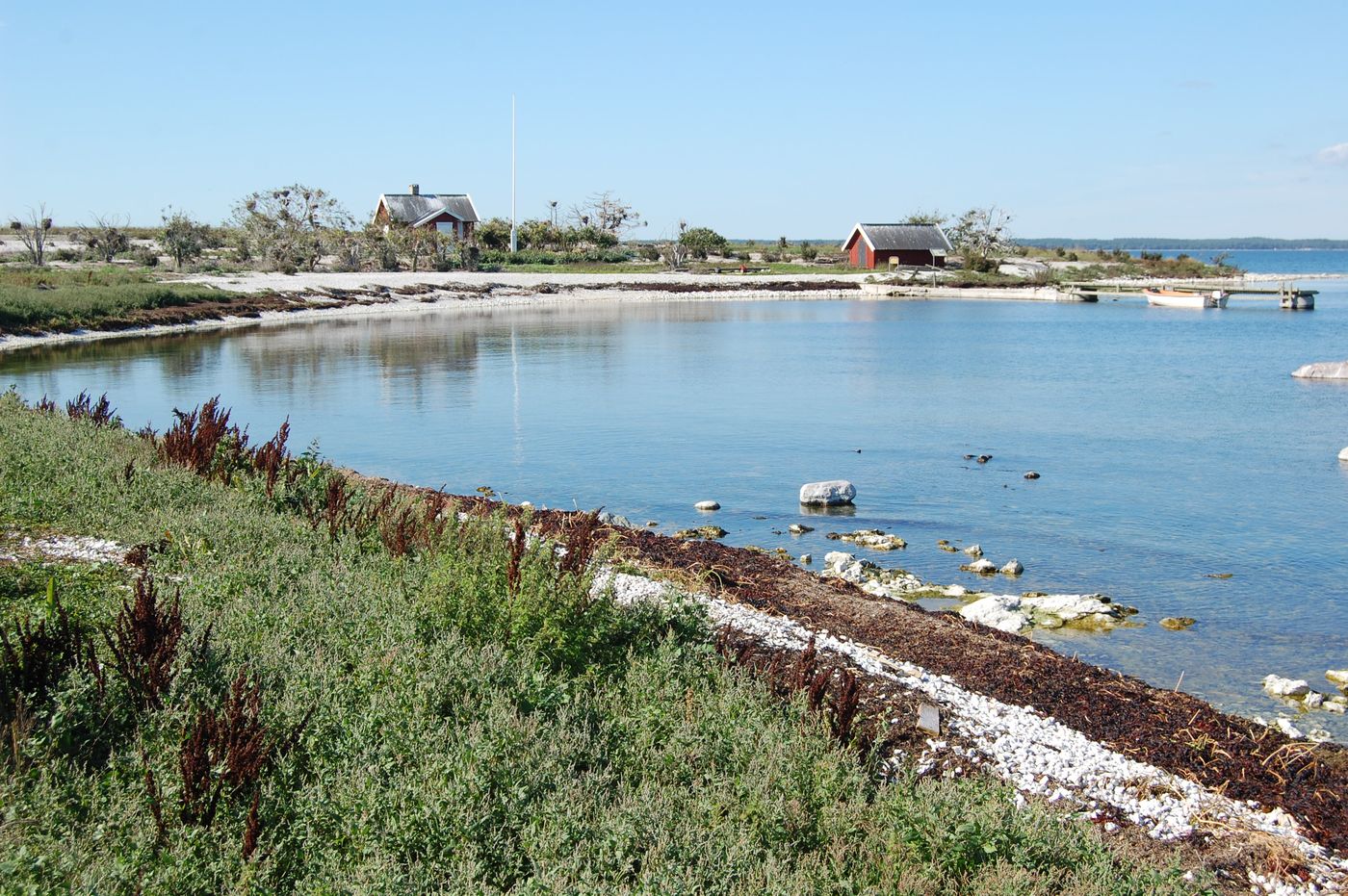 Sen åkte vi till Skarpholmen. Där åt vi matsäck på stocken ovanför bryggan och njöt av det fina vädret med glitter i vattnet. Vi såg till jaktstugan och bestämde oss för att bomma igen den för säsongen, för vi trodde att sommaren strax skulle vara slut. Men den varade i 5 veckor till och andra som åkte ut senare fick låsa upp för dagen. Vi gick sen runt och samlade upp skräp. Det blev trots allt en hel del, mest flaskor och plastförpackningar.