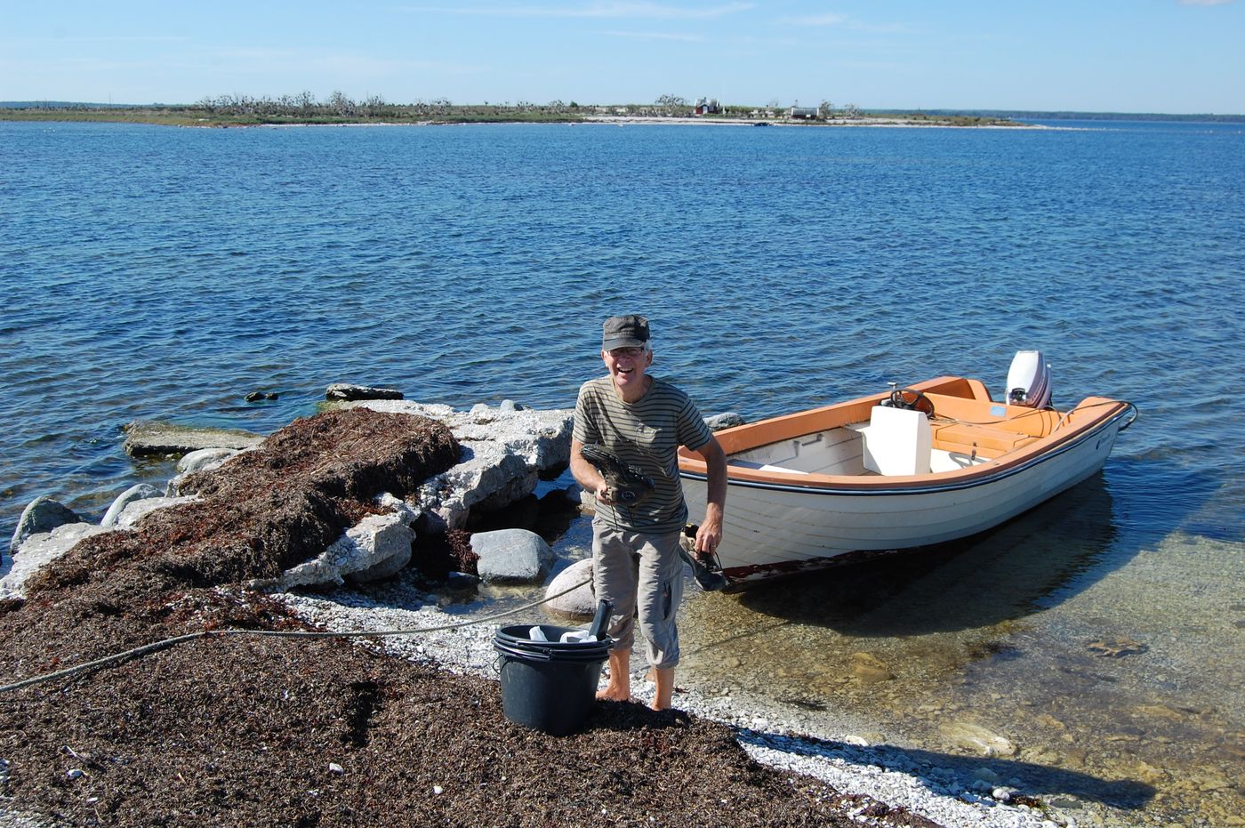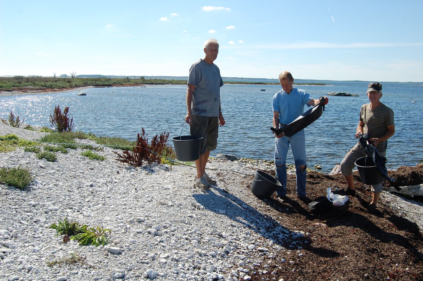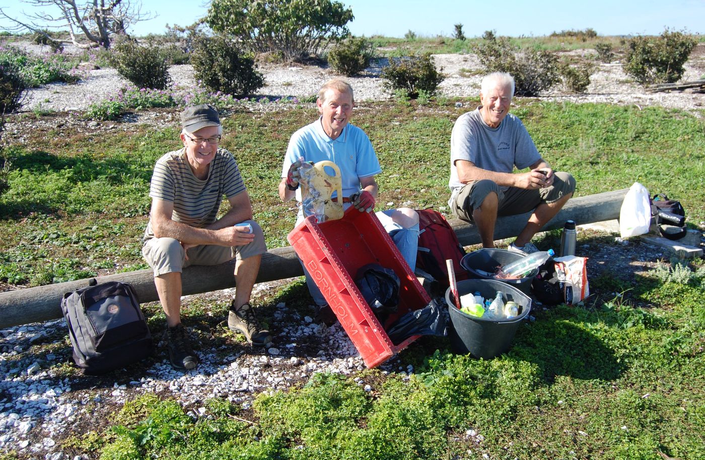 I strålande sommarväder den 24 augusti åkte Börje, Gunnar Andreas och Stefan ut med Börjes båt till Gräsholmen och Skarpholmen för att göra den årliga strandstädningen. Det blåste lite på utvägen, men väl ute på holmarna lugnade det ner sig till en svag bris. Vi klev först iland på Gräsholmen medförande spannar och sopsäckar. Gunnar och Andreas gick söderut och Börje och Stefan norrut och så möttes vi på mitten. Gräsholmen är större än man tror, betydligt större än Skarpholmen. Det var inte så särskilt mycket skräp, men vindarna hade också det gångna året varit mestadels sydvästliga. När vi kom tillbaka till båten, sorterade vi upp det vi hittat i olika spannar och säckar.
