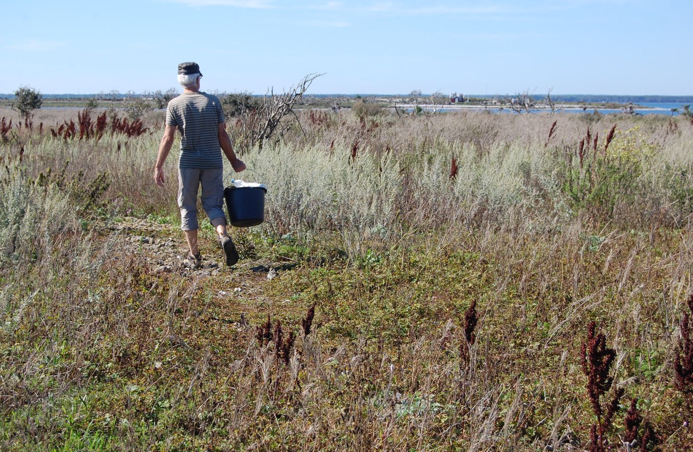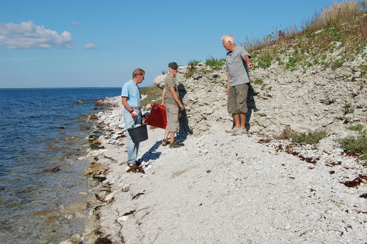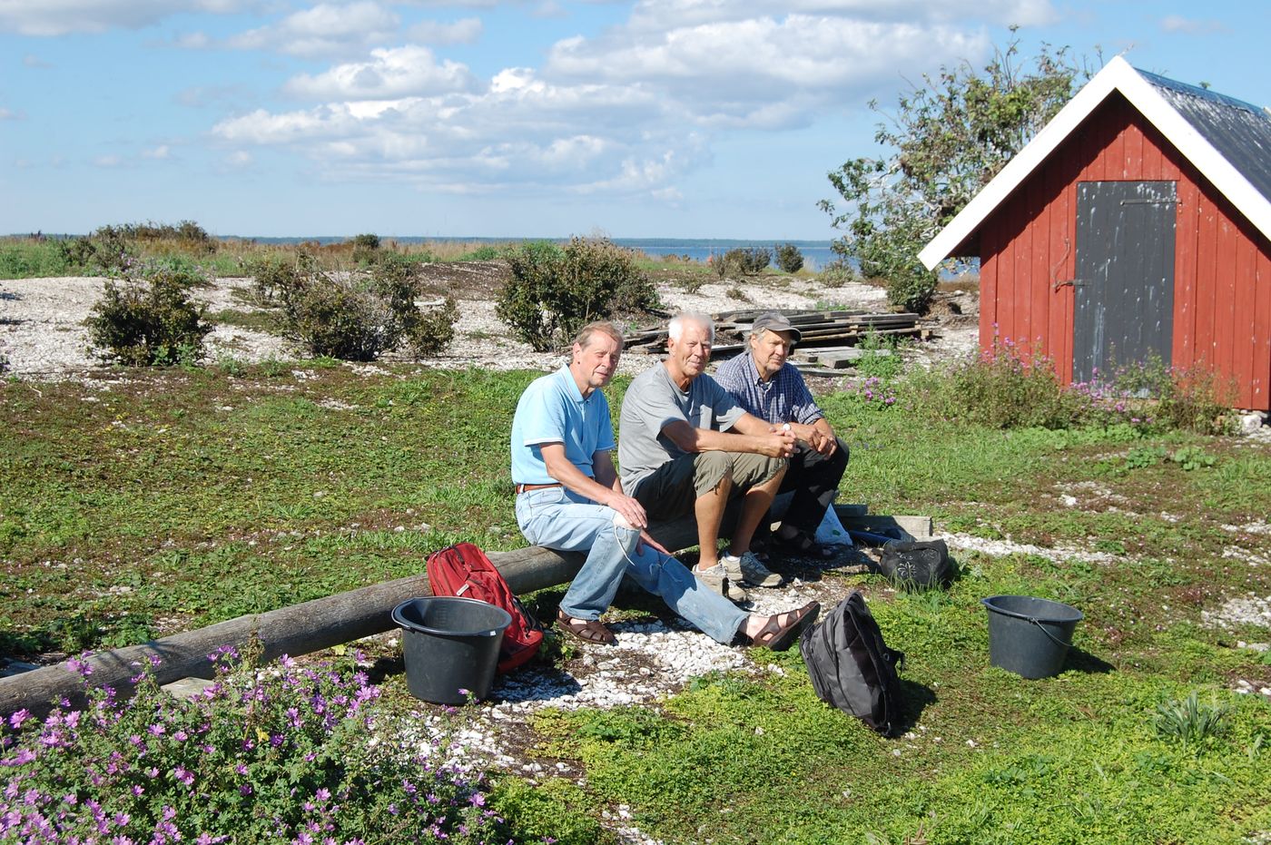I strålande sommarväder den 24 augusti åkte Börje, Gunnar Andreas och Stefan ut med Börjes båt till Gräsholmen och Skarpholmen för att göra den årliga strandstädningen. Det blåste lite på utvägen, men väl ute på holmarna lugnade det ner sig till en svag bris. Vi klev först iland på Gräsholmen medförande spannar och sopsäckar. Gunnar och Andreas gick söderut och Börje och Stefan norrut och så möttes vi på mitten. Gräsholmen är större än man tror, betydligt större än Skarpholmen. Det var inte så särskilt mycket skräp, men vindarna hade också det gångna året varit mestadels sydvästliga. När vi kom tillbaka till båten, sorterade vi upp det vi hittat i olika spannar och säckar.